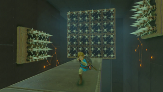 In the second chamber are two Gears spinning clockwise as walls covered in Floor Spikes are positioned to hurt Link if he does not navigate the Gears quickly enough. Though the Gears be walked across, Link may use the Stasis Rune to ensure his safety.